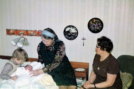 Staffan och nyfödda lillasyster Johanna med farmor Siri och mormor Anni som övervakare.