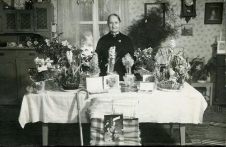 Lisa Nygård lärarinna i Tölby-Vikby skola 1917-1945 i klasserna 1-3. Fotograferad på sin 70 årsdag. Vid årsdagen uppvaktades hon av en grupp forna elever från vår skola varvid detta fotografi togs.