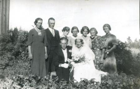 Brudparet Hugo Köping från Solf och Siri Thölix från Tölby. Stående fr v Vivi Forth, Erik Thölix, Ingrid Forth, okänd, Dagny Österholm, Hildur Thölix, okänd.